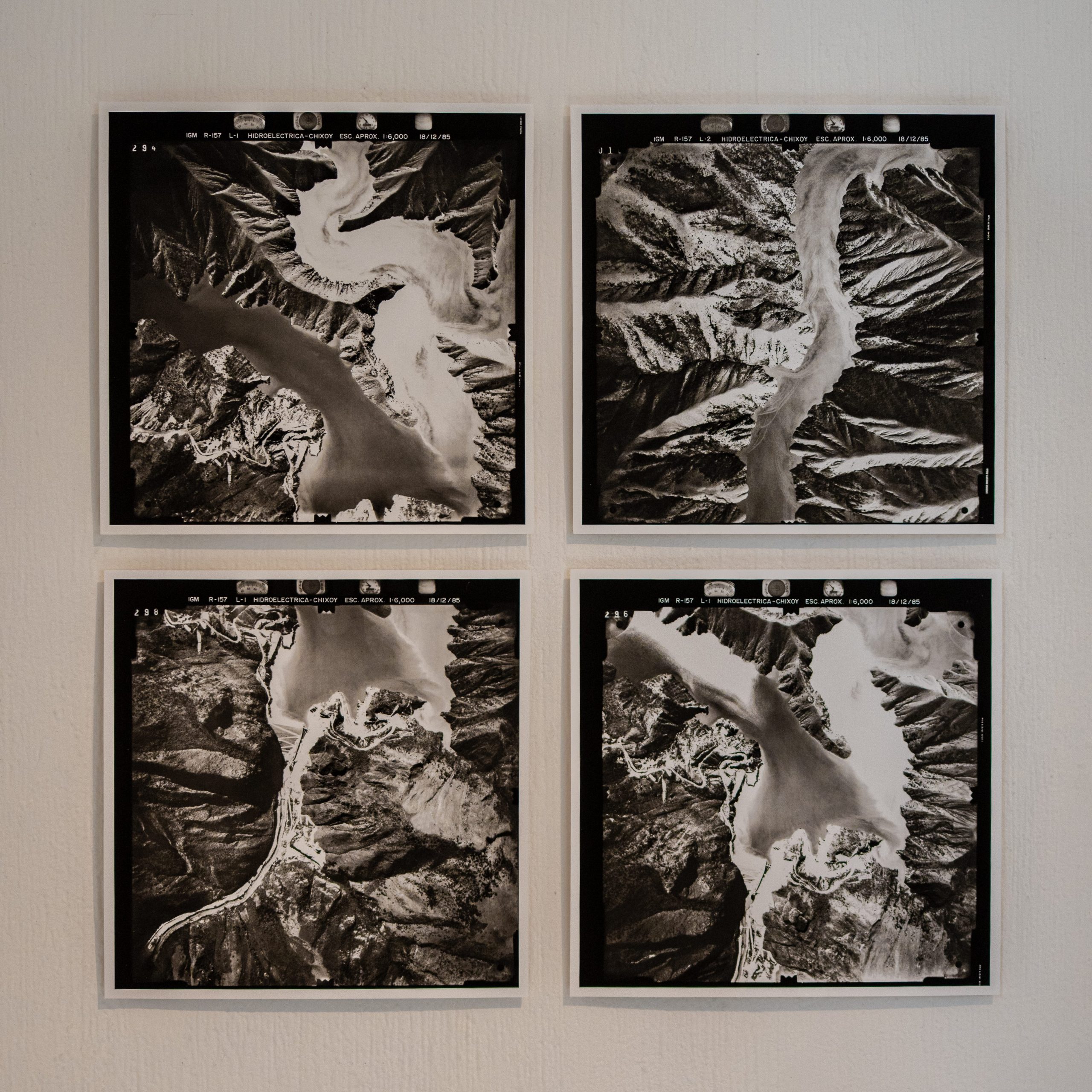 In this same gallery, history and lived reality are incorporated through the inclusion of photographs and maps from the National Geographic Institute (1972) and the Military Geographic Institute (1985), which document transformations of the territory in the Río Negro region, particularly in relation to the development of hydroelectric projects. These aerial-view maps are the result of research conducted by Julie Gibbings. On the walls, the poetry of Humberto Ak’abal and Francisco Morales Santos adds its own force and emotional depth.