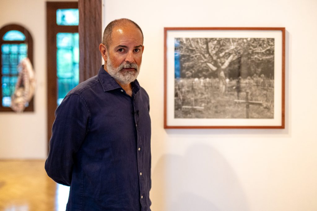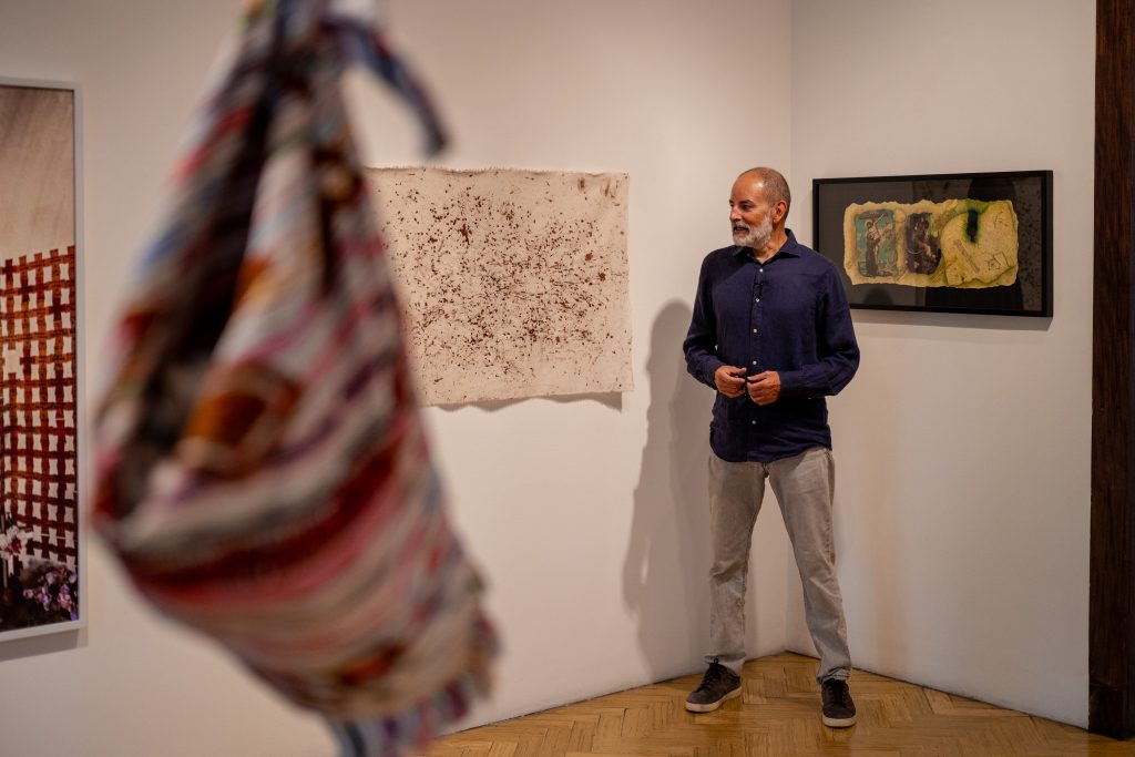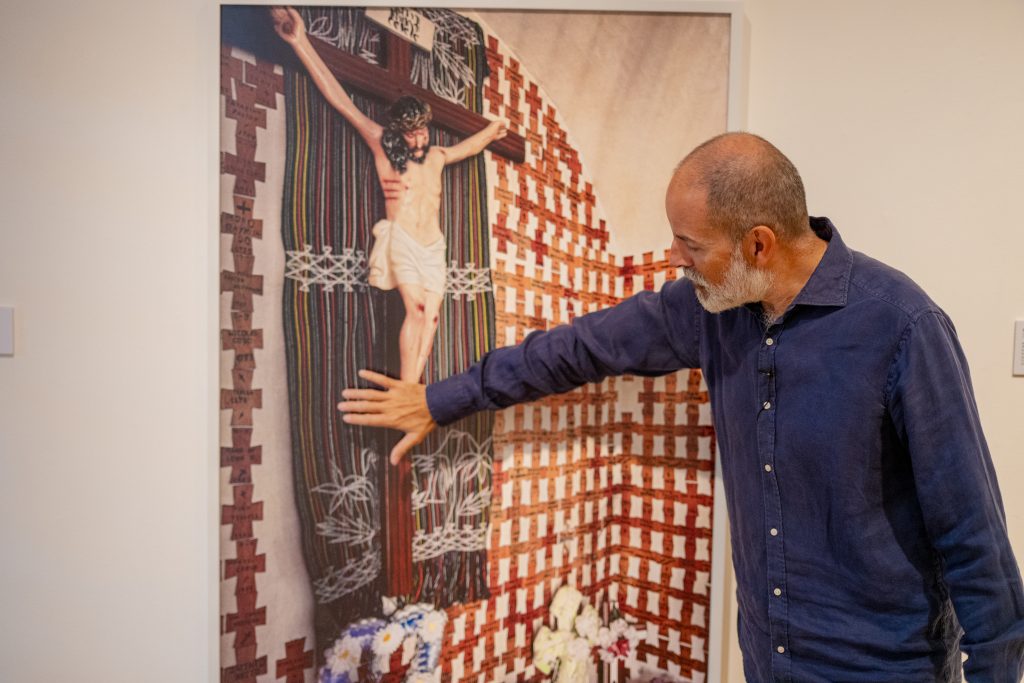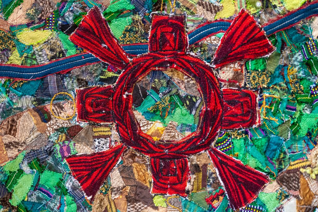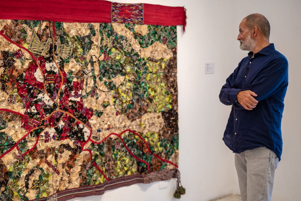The tour continues with works by Andrea Monroy Palacios from the series When I Die: Bearers (2023–2025). From a curatorial perspective, the installation directly alludes to the displacement of people during the internal armed conflict. It consists of canvases woven on floor looms by Guatemalan artisans, joined by lace-like randas and hand-embroidered by the artist, featuring representations of Guatemalan flora and fauna, including one specific to the Ixil region. Another of her works is a manta textile, embroidered white on white with the text There Is Not Only the Present, stained with banana sap, a fluid that leaves marks similar to blood. The works propose a symbolic reading of flight, trauma, and survival. This gallery takes its name from a work by Ceibal, The God of Life and Death, a singular collage within the artist’s production that adds another interpretive layer to the exhibition. This is complemented by a large-format color photograph by Daniel Chauche depicting a crucified Christ mounted vertically on a Chajul sash in Quiché, surrounded by wooden plaques in the shape of crosses bearing the names of those who died during the conflict in 1982 and 1983. The image evokes the most intense years of state violence.