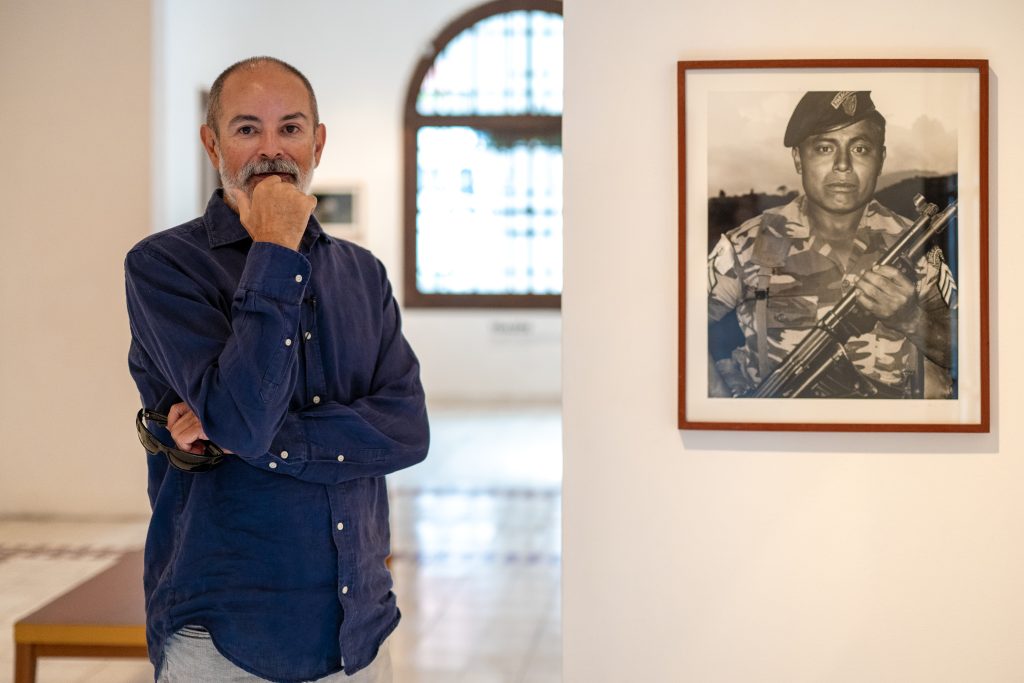 In the adjacent gallery, a photograph documents Aldea Modelo Las Violetas in Nebaj in 1988, showing three men identified as civil patrol members. These model villages, imposed by the Army, were part of a strategy of control and territorial reorganization in the highlands.