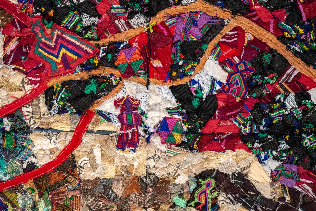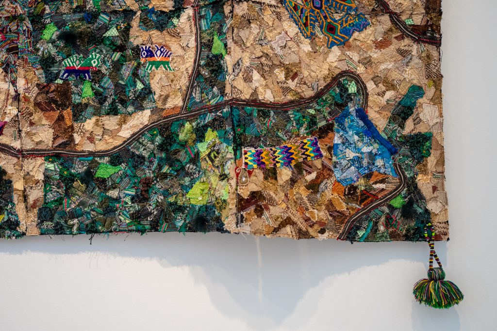 In dialogue with Chauche’s work—and as a result of the thoughtful exhibition design by Víctor and Gustavo Martínez, which includes a large-format photograph of a civil patrol member and other images of soldiers—is the work of Sylvia Tenenbaum, who presents her Woven Geographies (2016). These three textile works reinterpret territory based on community maps produced by the National Geographic Institute in the 1960s. The pieces were created using fragments from multiple cortes and güipiles belonging to Ixil women survivors. Exhibited together for the first time, each work functions as an affective cartography, in which threads reconstruct history from a feminine and communal experience. Although Tenenbaum lived outside Guatemala during the armed conflict, her return to the country prompted an in-depth investigation into memories of dispossession and cultural persistence. Her works reference Ixil territories: Santa María Nebaj, San Gaspar Chajul, and San Juan Cotzal.